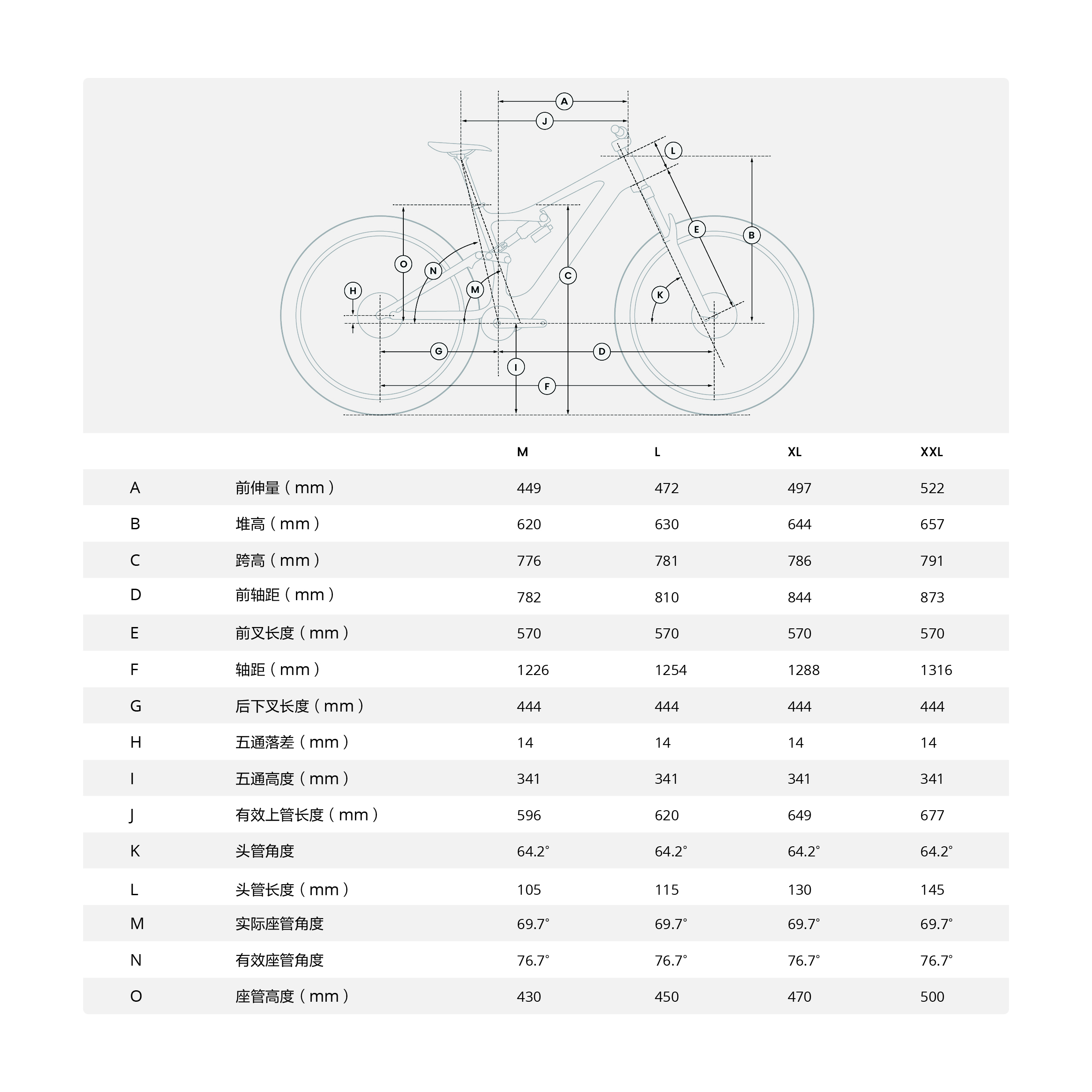 车辆原始配置的前避震最大行程为 160mm,偏移量 44mm,建议更换其他前避震时,需使用相同行程和偏移量的产品,保证车架几何处于最佳状态。